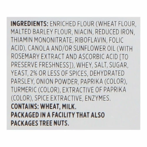 Enriched Flour (Wheat Flour, Malted Barley Flour, Niacin, Reduced Iron, Thiamin Mononitrate, Riboflavin, Folic Acid), Canola and/or Sunflower Oil (with Rosemary Extract and Ascorbic Acid [to Preserve Freshness]), Whey, Salt, Sugar, Yeast, 2% or Less of Spices, Dehydrated Parsley, Onion Powder, Paprika (Color), Turmeric (Color), Extractive of Paprika (Color), Spice Extractive, Enzymes.