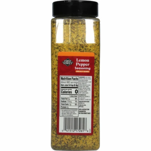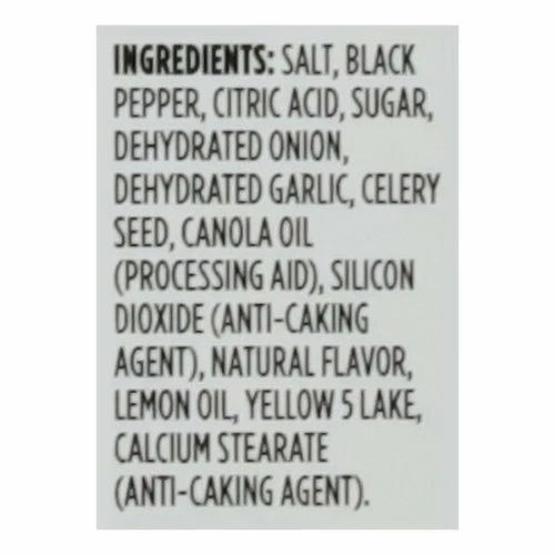 Salt, Black Pepper, Citric Acid, Sugar, Dehydrated Onion, Dehydrated Garlic, Celery Seed, Canola Oil (Processing Aid), Silicon Dioxide (Anti-Caking Agent), Natural Flavor, Lemon Oil, Yellow 5 Lake, Calcium Stearate (Anti-Caking Agent).