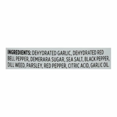 Dehydrated Garlic, Dehydrated Red Bell Pepper, Demerara Sugar, Sea Salt, Black Pepper Dill Weed, Parsley, Red Pepper, Citric Acid, Garlic Oil.