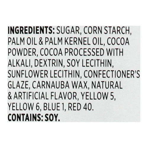 Sugar, Corn Starch, Palm Oil & Palm Kernel Oil, Cocoa Powder, Cocoa Processed with Alkali, Dextrin, Soy Lecithin, Sunflower Lecithin, Confectioner’s Glaze, Carnauba Wax, Natural & Artificial Flavor, Yellow 5, Yellow 6, Blue 1, Red 40.