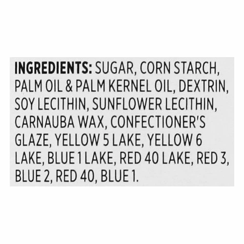 Sugar, Corn Starch, Palm Oil & Palm Kernel Oil, Dextrin, Soy Lecithin, Sunflower Lecithin, Carnauba Wax, Confectioner’s Glaze, Yellow 5 Lake, Yellow Lake, Blue 1 Lake, Red 40 Lake, Red 3, Blue 2, Red 40, Blue 1.