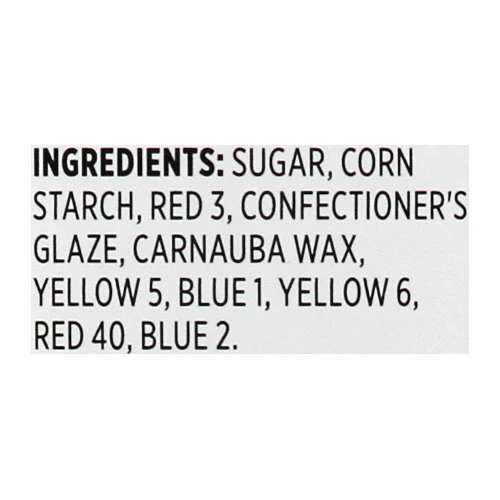 Sugar, Corn Strach, Red 3, Confectioner’s Glaze, Carnauba Wax, Yellow 5, Blue 1, Yellow 6, Red 40, Blue 2.