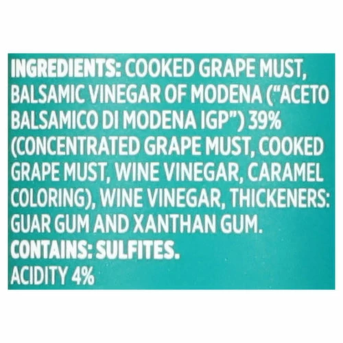 Cooked Grape Must, Balsamic Vinegar Of Modena (Ace To Balsamico Di Modena IGP) 39% (Concentrated Grape Must, Cooked Grape Must, Wine Vinegar, Caramel Coloring), Wine Vinegar, Thickeners, Guar Gum And Xanthan Gum.