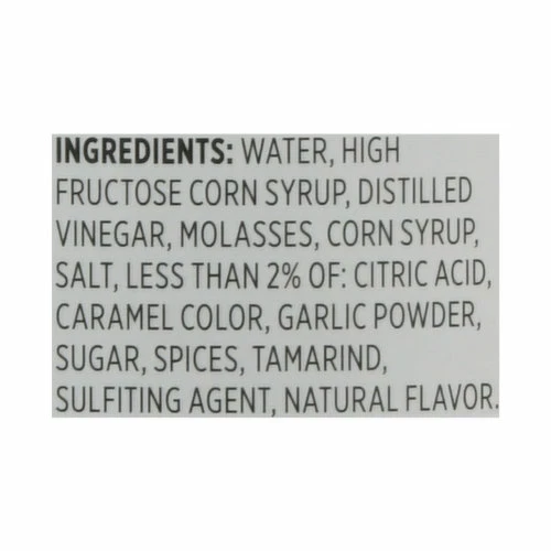 Water, High Fructose Corn Syrup, Distilled Vinegar, Worcestershire Sauce Base (Distilled Vinegar, Molasses, Corn Syrup, Water, Salt, Caramel Color, Garlic Powder, Sugar, Spices, Tamarind, Natural Flavor, Sulfiting Agent), Salt, Citirc Acid.