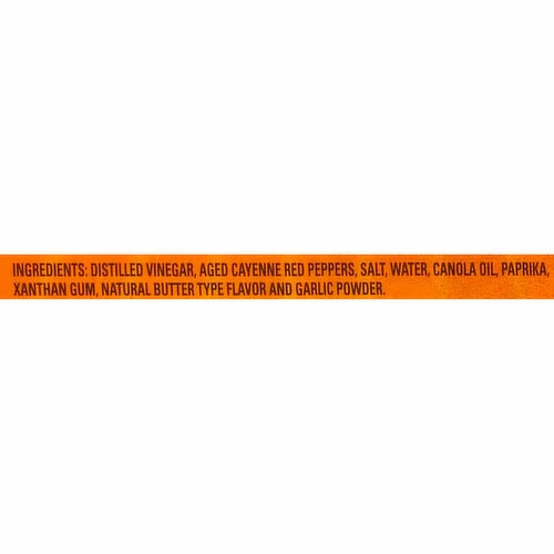 Distilled Vinegar, Aged Cayenne Red Peppers, Salt, Water, Canola Oil, Paprika, Xanthan Gum, Natural Butter Type Flavor and Garlic Powder.