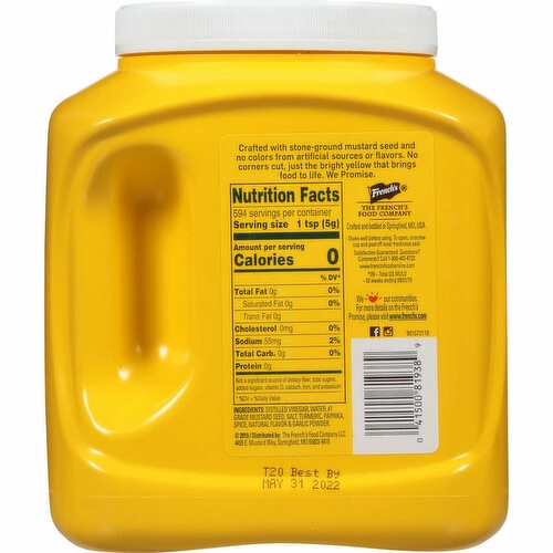 French’s Classic Yellow has remained the gold standard in mustard for over 100 years. Made with only #1 grade mustard seed, this popular product delivers unmatched flavor and quality for a consistently elevated dining experience. To create the signature tangy, creamy profile your customers enjoy, this yellow mustard is made using simple, high-quality ingredients sourced from a safe and controlled supply chain. These ingredients include high-quality mustard seed, distilled vinegar, turmeric, paprika and garlic powder. After the ingredients are sourced, certified master grinders work to ensure the perfect mustard grind every time. When you offer French’s Classic Yellow Mustard in your restaurant, you can benefit from its: – Consistent flavor: Careful sourcing and processing methods help ensure French’s mustard delivers the same great flavor in every bottle to keep customers coming back for more. – Pure formula: This yellow mustard does not include high-fructose corn syrup, gluten, dairy, peanuts, tree nuts or soybeans. The product is also kosher, so guests with a wide variety of dietary restrictions can enjoy your food. – Visual appeal: How a dish looks is just as important as how it tastes. French’s Classic Yellow Mustard features a bright yellow color and glossy appearance that will look good on its own and add striking color when mixed with other ingredients. French’s Classic Yellow Mustard comes ready to use — no preparation necessary. For the best flavor and texture, shake the container well before use. French’s Classic Yellow Mustard is shipped and stored at ambient temperatures and has a shelf life of 12 months. Protect the product from freezing and store it with the cap tightly closed to reduce the risk of contamination and maintain maximum product quality. For the best flavor, keep the container in the refrigerator after opening.