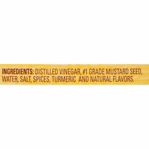 Distilled Vinegar, Number 1 Grade Mustard Seed, Water, Salt, Spices, Turmeric and Natural Flavors.