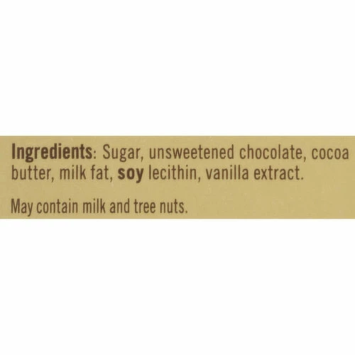 Sugar, Unsweetened Chocolate, Cocoa Butter, Milk Fat, Soy Lecithin, Vanilla Extract.