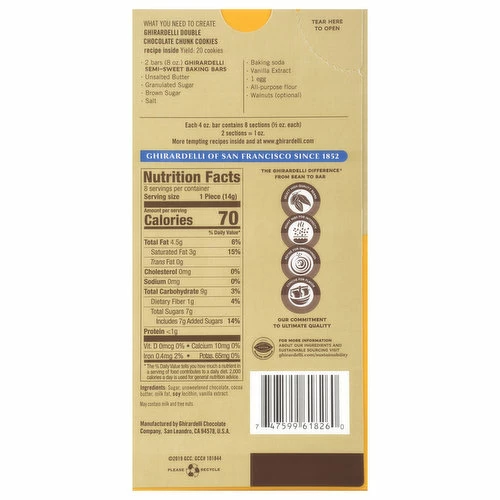 San Francisco. Founded in 1852. Recipe inside. From bean to bar. Our commitment to ultimate quality. Each 4 oz. bar contains 8 sections (1/2 oz. each) 2 sections = 1 oz. Ghirardelli of San Francisco since 1852. The Ghirardelli difference from bean to bar. Select high quality beans. Roast nibs for intensity. Refine for smoothness. Conche for flavor. Our commitment to ultimate quality. Please recycle. Cocoa Farming Program: For more information about our ingredients and sustainable sourcing visit ghirardelli.com/sustainability.