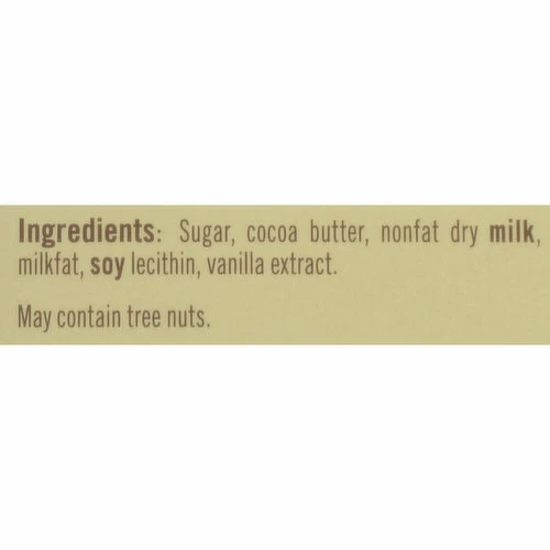 Sugar, Cocoa Butter, Nonfat Dry Milk, Milkfat, Soy Lecithin, Vanilla Extract.