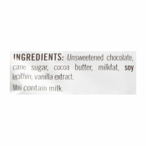 Unsweetened Chocolate, Cane Sugar, Cocoa Butter, Milkfat, Soy Lecithin, Vanilla Extract.