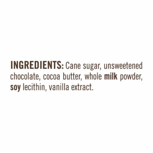 Cane Sugar, Unsweetened Chocolate, Cocoa Butter, Whole Milk Powder, Soy Lecithin, Vanilla Extract.