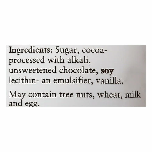 Sugar, Cocoa-Processed with Alkali, Unsweetened Chocolate, Soy Lecithin – an Emulsifier, Vanilla.
