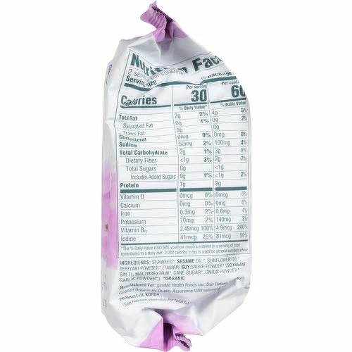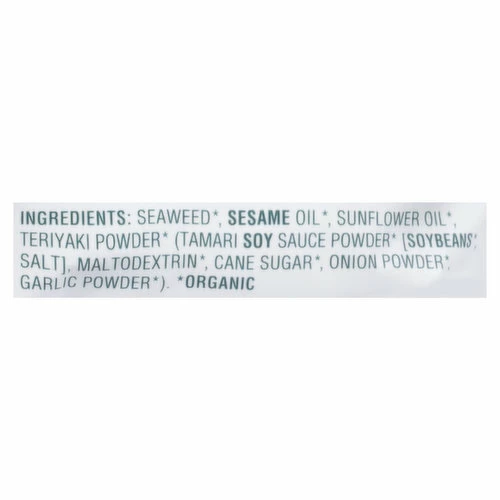 Seaweed (Organic), Sesame Oil (Organic), Sunflower Oil (Organic), Teriyaki Powder (Organic) (Tamari Soy Sauce Powder (Organic) [Soybeans (Organic), Salt], Maltodextrin (Organic), Cane Sugar (Organic), Onion Powder (Organic), Garlic Powder (Organic)).