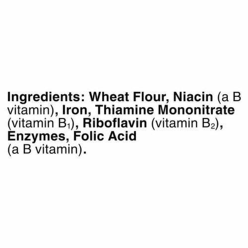 Wheat Flour, Niacin (A B Vitamin), Iron, Thiamine Mononitrate (Vitamin B1), Riboflavin (Vitamin B2), Enzymes, Folic Acid (A B Vitamin).