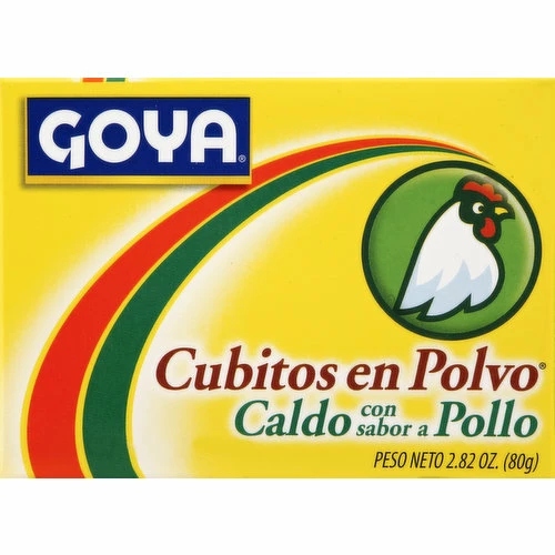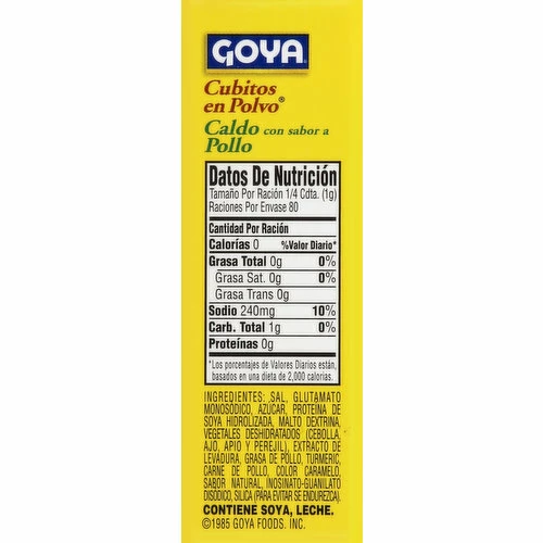 Salt, Monosodium Glutamate, Sugar, Hydrolyzed Soy Protein, Malto Dextrin, Dehydrated Vegetables (Onion, Garlic, Celery and Parsley), Yeast Extract, Chicken Fat, Turmeric, Chicken Meat, Caramel Color, Natural Flavor, Disodium Inosinate and Guanylate, Silica (Anti-Caking Agent).