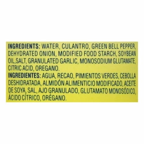 Water, Culantro, Green Bell Pepper, Dehydrated Onion, Modified Food Starch, Soybean Oil, Salt, Granulated Garlic, Monosodium Glutamate, Citric Acid, Oregano.