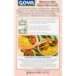 0 g trans fat. Gluten free. Cholesterol free. Fat free. Add a little Mexican excitement to any meal with tasty, colorful Goya Mexican Rice! Whole kernels of corn, bell peppers, onion, garlic and bits of jalapeno in a mix of Goya Long Grain Rice with chicken flavor. It goes great with Mexican dishes, and with meats, chicken and pork chops. Another way Goya brings great taste home to every cook’s kitchen. www.goya.com. For all the foods, recipes and cuisines of Latin America, visit goya.com the ultimate resource for Latino cooking.