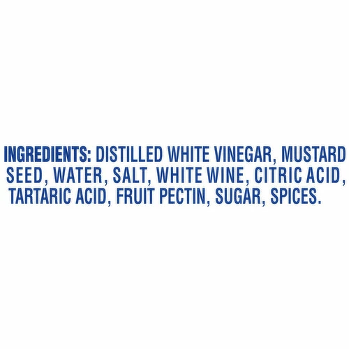 Distilled White Vinegar, Mustard Seed, Water, Salt, White Wine, Citric Acid, Tartaric Acid, Fruit Pectin, Sugar, Spices.