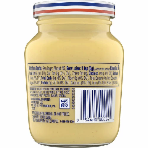 5 calories per 1 tsp. See nutrition information for sodium content. Made with white wine. Since 1777, Grey Poupon Dijon Mustard has been prepared in accordance with the original recipe from Dijon, France for Mustard-lovers with discerning taste. Made with #1 Grade Mustard Seeds, this white wine infused mustard is blended with spices offer the gourmet flavor you expect from Grey Poupon. By bringing the refined taste of Grey Poupon Dijon Mustard to your favorite dishes and recipes, you can truly treat yourself to the finer things in life. Mix this tangy mustard sauce with balsamic vinegar and olive oil to create a delicious salad dressing, or use it as an ingredient to make a gourmet Dijon Mustard glaze and enhance your favorite chicken or pork entree. Whether you’re snacking or preparing for a dinner party, Grey Poupon Dijon Mustard will elevate your next occasion. This Dijon Mustard is packaged in a 8 ounce resealable jar for easy application and lasting freshness.
