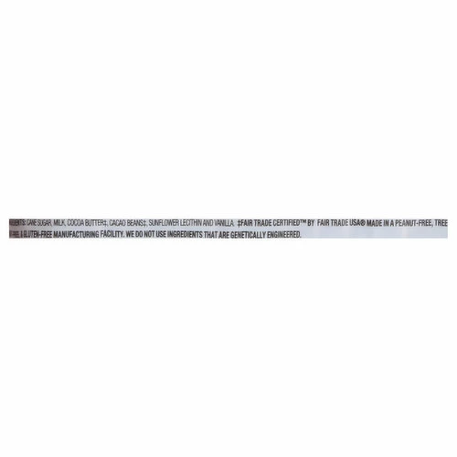 Cane Sugar, Milk, Cocoa Butter (Fair Trade Certified by Fairtradeusa.org), Cacao Beans (Fair Trade Certified by Fairtradeusa.org), Sunflower Lecithin and Vanilla.