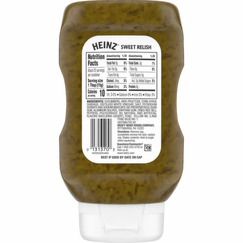 Featuring crunchy pickled cucumber and cabbage immersed in vinegar, Heinz Sweet Relish will help you create flavors which complement any dish. With chunks of red bell pepper and extracts of turmeric, this 12.7 fluid ounce bottle of Heinz Sweet Relish will add a completely new dimension of flavors to your favorite dish. This relish is prepared with care so that every bottle has the perfect ratio of ingredients to complement your favorite foods. Just drizzle this relish on top of your food or use it as a dip and the crunch from cucumbers and cabbage will add life to any meal.