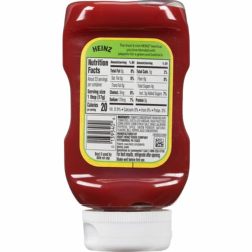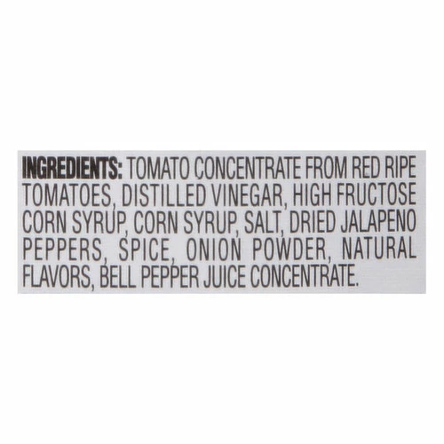 Tomato Concentrate from Red Ripe Tomatoes, Distilled Vinegar, High Fructose Corn Syrup, Corn Syrup, Salt, Dried Jalapeno Peppers, Spice, Onion Powder, Natural Flavors, Bell Pepper Juice Concentrate.