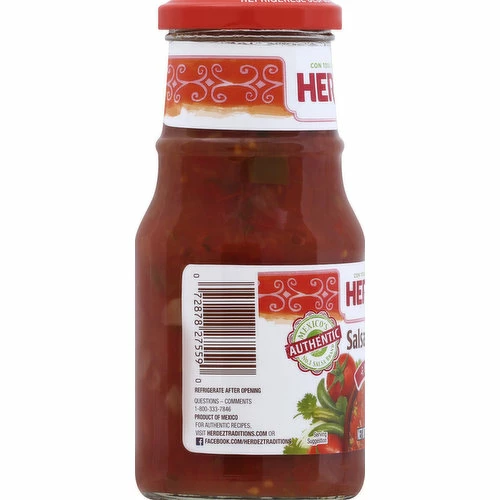 Authentic Mexico’s No. 1 salsa brand. Questions – comments 1-800-333-7846. For authentic recipes, visit herdeztraditions.com or Facebook: Facebook.com/herdeztraditions. Product of Mexico.