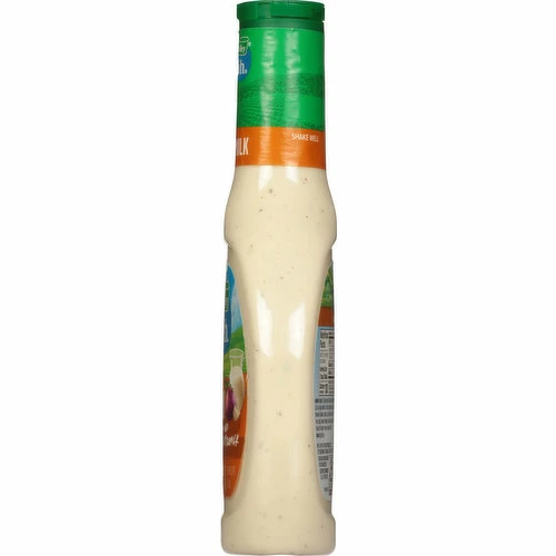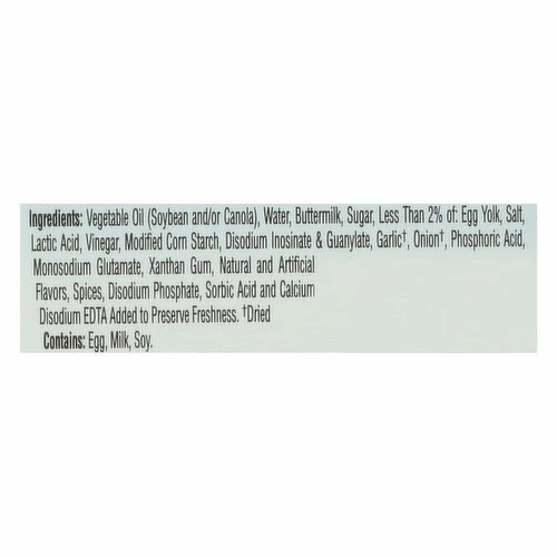 Vegetable Oil (Soybean and/or Canola), Water, Buttermilk, Sugar, Less than 2% of: Egg Yolk, Salt, Lactic Acid, Vinegar, Modified Corn Starch, Disodium Inosinate & Guanylate, Garlic (Dried), Onion (Dried), Phosphoric Acid, Monosodium Glutamate, Xanthan Gum, Natural and Artificial Flavors, Spices, Disodium Phosphate, Sorbic Acid and Calcium Disodium EDTA Added to Preserve Freshness.