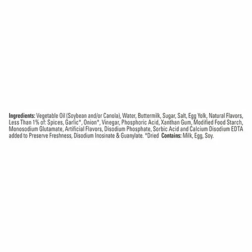 Vegetable Oil (Soybean and/or Canola), Water, Buttermilk, Sugar, Salt, Egg Yolk, Natural Flavors, Less than 1% of: Spices, Garlic (Dried), Onion (Dried), Vinegar, Phosphoric Acid, Xanthan Gum, Modified Food Starch, Monosodium Glutamate, Artificial Flavors, Disodium Phosphate, Sorbic Acid and Calcium Disodium EDTA Added to Preserve Freshness, Disodium Inosinate & Guanylate.