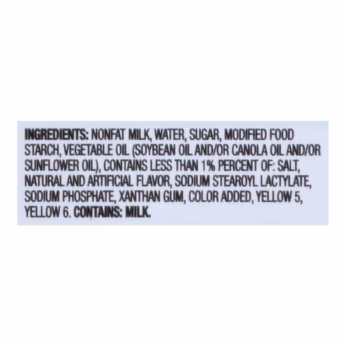 Nonfat Milk, Water, Sugar, Modified Food Starch, Vegetable Oil (Soybean Oil and/or Canola Oil and/or Sunflower Oil), Contains Less than 1% Percent of: Salt, Natural and Artificial Flavor, Sodium Stearoyl Lactylate, Sodium Phosphate, Xanthan Gum, Color Added, Yellow 5, Yellow 6.