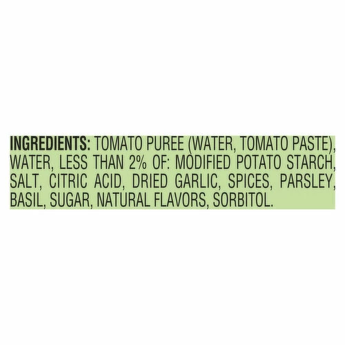Tomato Puree (Water, Tomato Paste), Water, Less than 2% of: Modified Potato Starch, Salt, Citric Acid, Dried Garlic, Spices, Parsley, Basil, Sugar, Natural Flavors, Sorbitol.