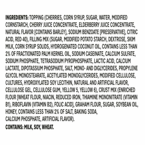 Topping (Cherries, Corn Syrup, Sugar, Water, Modified Cornstarch, Cherry Juice Concentrate, Elderberry Juice Concentrate, Natural Flavor [Contains Barley], Sodium Benzoate [Preservative), Citric Acid, Red 40), Filling Mix (Sugar, Modified Potato Starch, Dextrose, Skim Milk, Corn Syrup Solids, Hydrogenated Coconut Oil, Contains Less than 2% of Fractionated Palm Kernel Oil, Sodium Caseinate, Calcium Sulfate, Sodium Phosphate, Tetrasodium Pyrophosphate, Lactic Acid, Calcium Lactate, Dipotassium Phosphate, Salt, Mono- and Diglycerides, Propylene Glycol Monostearate, Acetylated Monoglycerides, Modified Cellulose, Cultures, Hydroxylated Soy Lecithin, Natural and Artificial Flavor, Cellulose Gel, Cellulose Gum, Yellow 5, Yellow 6), Crust Mix (Enriched Flour [Wheat Flour, Niacin, Reduced Iron, Thiamine Mononitrate (Vitamin B1), Riboflavin (Vitamin B2), Folic Acid), Graham Flour, Sugar, Soybean Oil, Honey, Contains Less than 2% of Salt, Baking Soda, Calcium Phosphate, Artificial Flavor).