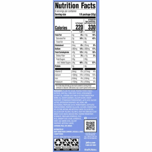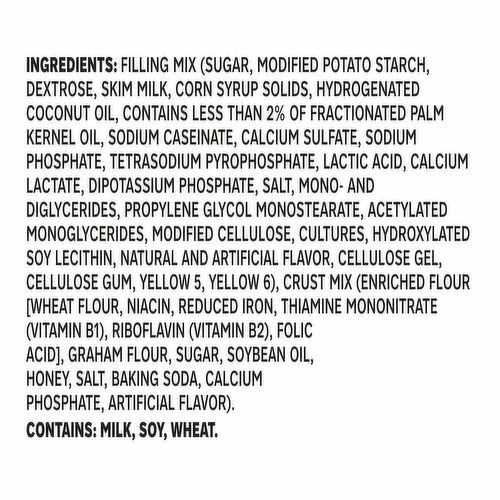 Filling Mix (Sugar, Modified Potato Starch, Dextrose, Skim Milk, Corn Syrup Solids, Hydrogenated Coconut Oil, Contains Less than 2% of Fractionated Palm Kernel Oil, Sodium Caseinate, Calcium Sulfate, Sodium Phosphate, Tetrasodium Pyrophosphate, Lactic Acid, Calcium Lactate, Dipotassium Phosphate, Salt, Mono- and Diglycerides, Propylene Glycol Monostearate, Acetylated Monoglycerides, Modified Cellulose, Cultures, Hydroxylated Soy Lecithin, Natural and Artificial Flavor, Cellulose Gel, Cellulose Gum, Yellow 5, Yellow 6), Crust Mix (Enriched Flour [Wheat Flour, Niacin, Reduced Iron, Thiamine Mononitrate (Vitamin B1), Riboflavin (Vitamin B2), Folic, Acid], Graham Flour, Sugar, Soybean Oil, Honey, Salt, Baking Soda, Calcium Phosphate, Artificial Flavor).