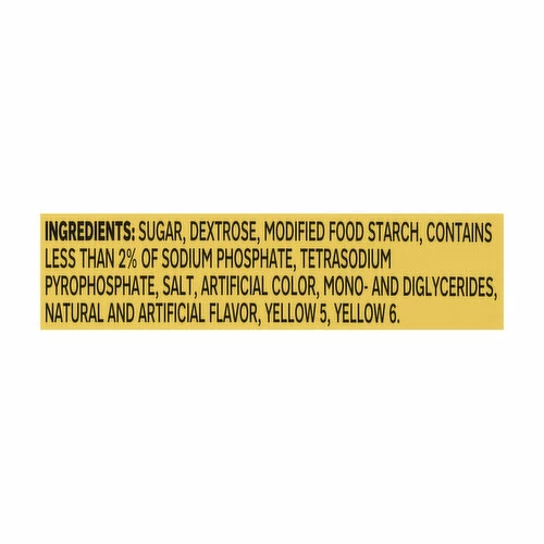 Sugar, Dextrose, Modified Cornstarch, Contains Less than 2% of Disodium Phosphate, Tetrasodium Pyrophosphate, Salt, Artificial Color, Mono- and Diglycerides, Natural and Artificial Flavor, Yellow 5, Yellow 6.