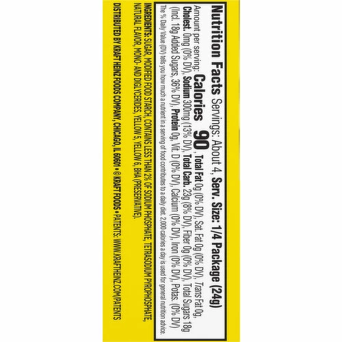 Sugar, Modified Food Starch, Contains Less than 2% of Sodium Phosphate, Tetrasodium Pyrophosphate, Natural Flavor, Mono – and Diglycerides, Yellow 5, Yellow 6, BHA (Preservative).