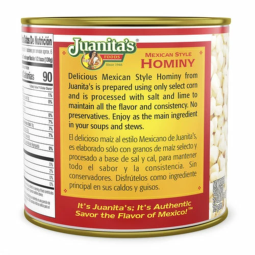 Our Mexican Style Hominy adds an authentic flavor to your Mexican soups and other recipes. What is Hominy? Hominy is a traditional authentic Mexican food made from kernels of corn. It is produced using a century old process called “nixtamalization.” This is the same process Mexican cooks have used to make corn for tamales and tortillas. This is a natural process where the corn is cooked using very minimal ingredients. Hominy is a staple in Mexican cooking, often used in Mexican soups, stews, and other dishes. Mexican Style Hominy is used to make used to make Slow Cooked Pork Pozole with Red Chile.