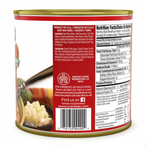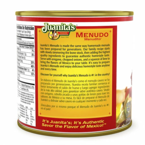 Bring the Flavors of Mexico to Your Table. Juanita’s Original Menudo is prepared with the original flavor that has been kept alive for generations. Heat and serve anytime for homemade taste every time. Our canned Menudo soup is made the same way it’s been prepared for generations. Juanita’s family Menudo recipe starts with slowly simmering the bone stock, then adding the highest quality ingredients for an authentic flavor. Serve with oregano, chopped onions, and a squeeze of lime to bring the flavors of Mexico to your table.