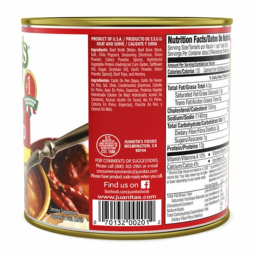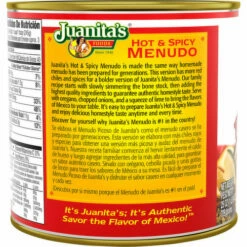 Rev Your Taste Buds.Juanita’s Hot & Spicy Menudo is prepared with more red chile and spices for a bolder version of the Original Menudo to rev your taste buds. Heat and serve anytime for homemade taste every time. Our canned Menudo soup is made the same way it’s been prepared for generations. Juanita’s family Menudo recipe starts with slowly simmering the bone stock, then adding the highest quality ingredients for an authentic flavor. Serve with oregano, chopped onions, and a squeeze of lime to bring the flavors of Mexico to your table.