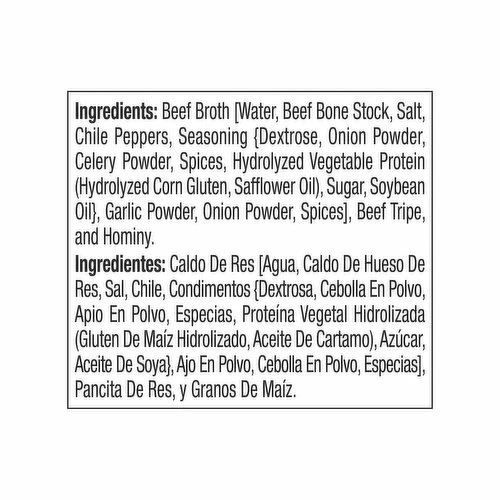 Beef Broth [Water, Beef Bone Stock, Salt, Chile Peppers, Seasoning {Dextrose, Onion Powder, Celery Powder, Spices, Hydrolyzed Vegetable Protein (Hydrolyzed Corn Gluten, Safflower Oil), Sugar, Soybean Oil}, Garlic Powder, Onion Powder, Spices], Beef Tripe, and Hominy.