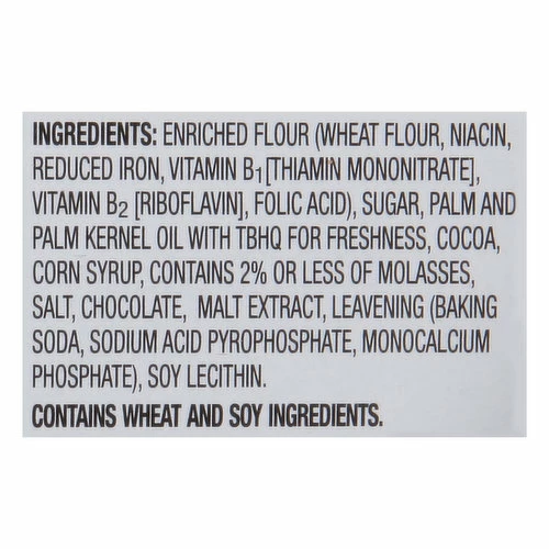 Enriched Flour (Wheat Flour, Niacin, Reduced Iron, Vitamin B1 [Thiamin Mononitrate], Vitamin B2 [Riboflavin], Folic Acid), Sugar, Palm and Palm Kernel Oil with TBHQ for Freshness, Cocoa, Corn Syrup, Contains 2% or Less of Molasses, Salt, Chocolate, Malt Extract, Leavening (Baking Soda, Sodium Acid Pyrophosphate, Monocalcium Phosphate), Soy Lecithin.