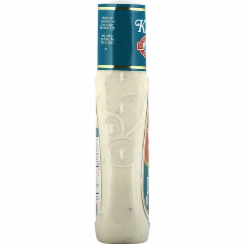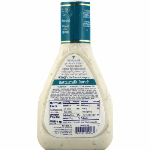 Gluten free. Fresh buttermilk gives Ken’s Steak House Buttermilk Ranch its signature thick, creamy texture while our garlic, onion and spice blend give it delicious bold flavor. Ken’s a family owned company. Satisfaction guaranteed or your money back from Ken. www.kensfoods.com. Questions/Comments? Please include complete best when purchased by date. Call 1-800-645-5707 M-F 9AM – 5PM EST. www.kensfoods.com. Product of USA.