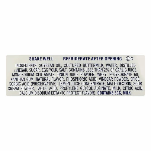 Soybean Oil, Cultured Buttermilk, Water, Distilled Vinegar, Sugar, Egg Yolk, Salt, Contains Less than 2% of Garlic Juice, Monosodium Glutamate, Onion Juice Powder, Whey, Polysorbate 60, Xanthan Gum, Natural Flavor, Phosphoric Acid, Vinegar Powder, Spice, Sorbic Acid (Preservative), Lemon Juice Concentrate, Maltodextrin, Sour Cream Powder, Lactic Acid, Propylene Glycol Alginate, Milk, Citric Acid, Calcium Disodium EDTA (to Protect Flavor).