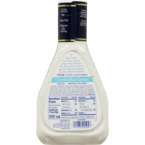 1941. Ken’s Chunky Blue Cheese signature recipe is made with aged blue cheese, garlic, onion and spice for a bold, rich dressing in the classic steak house tradition. Ken’s: A Family owned company.