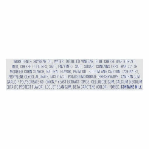 Soybean Oil, Water, Distilled Vinegar, Blue Cheese (Pasteurized Milk, Cheese Cultures, Salt, Enzymes), Salt, Sugar, Contains Less than 2% of Modified Corn Starch, Natural Flavor, Palm Oil, Sodium and Calcium Caseinates, Propylene Glycol Alginate, Lactic Acid, Potassium Sorbate (Preservative), Xanthan Gum, Garlic (Dried), Polysorbate 60, Onion (Dried), Yeast Extract, Spice, Cellulose Gum, Calcium Disodium EDTA (to Protect Flavor), Locust Bean Gum, Beta Carotene (Color).