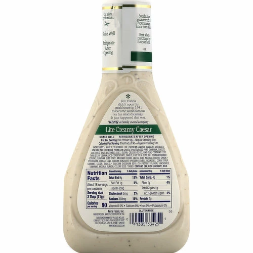 Fat Per Serving: This product 9 g – regular dressing 19 g. Calories Per Serving: this product 90 – regular dressing 180. Gluten free. Lite: 50% less fat. 48% fewer calories than regular dressing. See nutrition information for sodium content. Ken Hanna didn’t open his steak house in 1941 to become world-famous for his salad dressings. It just happened that way. Ken’s a Family owned company. Satisfaction guaranteed or your money back from Ken. www.kensfoods.com. Questions/Comments? Please include complete best when purchased by date. Call 1-800-645-5707 M – F 9am – 5pm EST. Product of USA.
