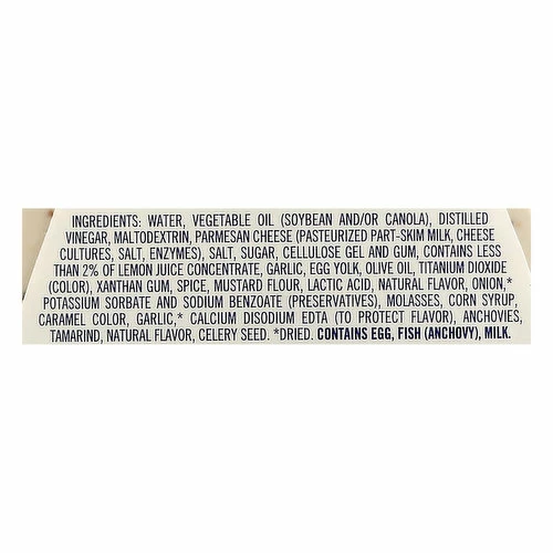 Water, Vegetable Oil (Soybean and/or Canola), Distilled Vinegar, Maltodextrin, Parmesan Cheese (Pasteurized Part-Skim Milk, Cheese Cultures, Salt, Enzymes), Salt, Sugar, Cellulose Gel and Gum, Contains Less than 2% of Lemon Juice Concentrate, Garlic, Egg Yolk, Olive Oil, Titanium Dioxide (Color), Xanthan Gum, Spice, Mustard Flour, Lactic Acid, Natural Flavor, Onion (Dried), Potassium Sorbate and Sodium Benzoate (Preservatives), Molasses, Corn Syrup, Caramel Color, Garlic (Dried), Calcium Disodium EDTA (to Protect Flavor), Anchovies, Tamarind, Natural Flavor, Celery Seed.