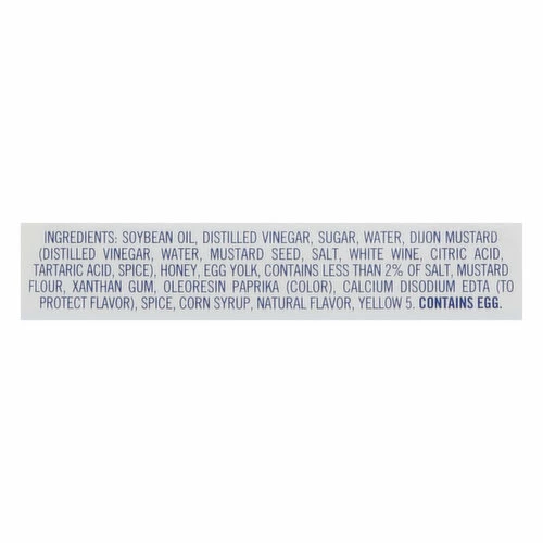 Soybean Oil, Distilled Vinegar, Sugar, Water, Dijon Mustard (Distilled Vinegar, Water, Mustard Seed, Salt, White Wine, Citric Acid, Tartaric Acid, Spice), Honey, Egg Yolk, Contains Less than 2% of Salt, Mustard Flour, Xanthan Gum, Oleoresin Paprika (Color), Calcium Disodium EDTA (to Protect Flavor), Spice, Corn Syrup, Natural Flavor, Yellow 5.