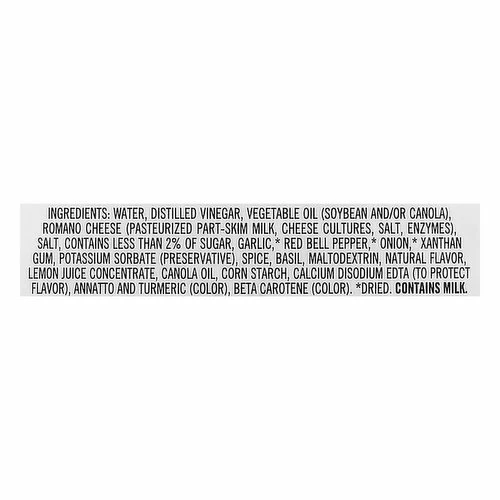 Water, Distilled Vinegar, Vegetable Oil (Soybean and/or Canola), Romano Cheese (Pasteurized Part-Skim Milk, Cheese Culture, Salt, Enzymes), Salt, Contains Less than 2% of Sugar, Garlic (Dried), Red Bell Pepper (Dried), Onion (Dried), Xanthan Gum, Potassium Sorbate (Preservative), Spice, Basil, Maltodextrin, Natural Flavor, Lemon Juice Concentrate, Canola Oil, Corn Starch, Calcium Disodium EDTA (to Protect Flavor), Annatto and Turmeric (Color), Beta Carotene (Color).