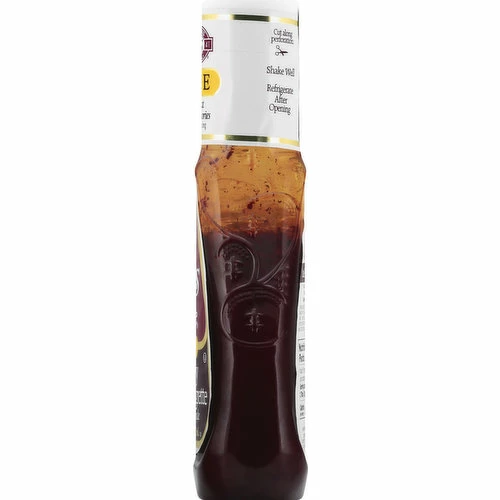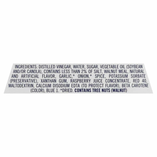 Distilled Vinegar, Water, Sugar, Vegetable Oil (Soybean and/or Canola), Contains Less than 2% of Salt, Walnut Meal, Natural and Artificial Flavor, Garlic (Dried), Onion (Dried), Spice, Potassium Sorbate (Preservative), Xanthan Gum, Raspberry Juice Concentrate, Red 40, Maltodextrin, Calcium Disodium EDTA (to Protect Flavor), Beta Carotene (Color), Blue 1.